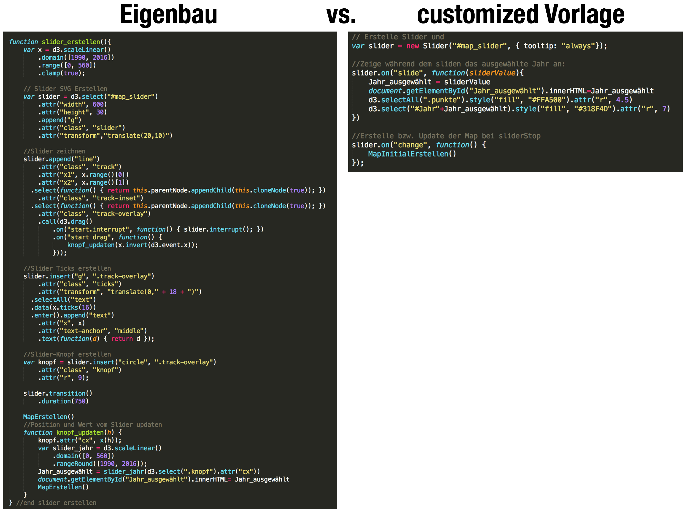 Bestehende Scripts verwenden - Ich habe ganze Nächte damit verbracht einen Slider in D3 von Grund auf selber zu bauen, nur um am Schluss festzustellen, dass man es mit einem im Internet veröffentlichten Script viel besser und eleganter lösen könnte. Durch das Verwenden von öffentlichen Bibliotheken spart man sich viel Zeit und schont meistens auch die Nerven.