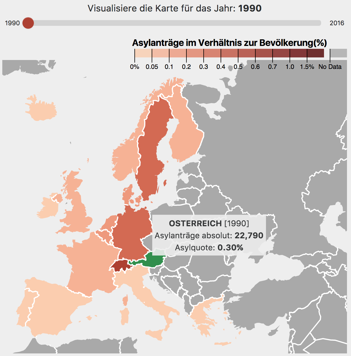 Die Karte zeigt die Anzahl der eingegangenen Asylanträge der einzelnen Länder, für das mittels des Sliders ausgewählte Jahr. Die Karte wird dann je nach Anzahl der Asylanträge im ausgewählten Jahr gemäss der dargestellten Skala eingefärbt. Für alle grau eingefärbten Länder existieren zu diesem Zeitpunkt keine Daten. Mittels Dropdown-Menü können die Daten in absoluten Zahlen oder im Verhältnis zur Wohnbevökerung dargestellt werden. Wenn man mit der Maus über ein entsprechendes Land fährt (mouseover), wird ein Tooltip mit den genauen Asylanträgen und der Asylquote eingeblendet.